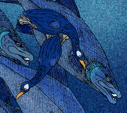 Maybe it was tasty, too, because its bones are found abundantly in old kitchen middens on the California Channel Islands and along the coast. Although with all that diving it must have been tough. Tough and fishy. (Plenty of tough fishy meat for the whole gang!)