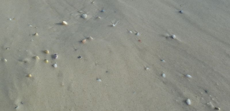 I waded in to the mild water. When waves receded, small shells became visible. Nice.