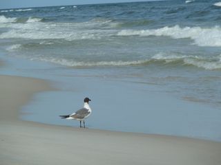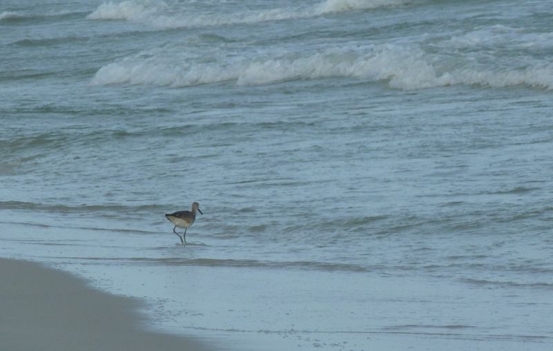 I'd never visited Alabama beaches. The sand was luminously pale, almost as white as the sugar it is compared to. And clean. The water was clear except for swirling sand. Along the beach birds lined up, studying the water. When a wave receded, a gull or a willet would often sprint forward and snatch something.