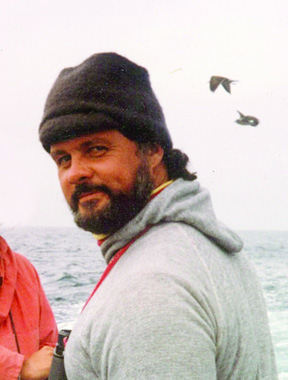 This photo of Rich Stallcup appears in a lobby display at the headquarters of PRBO Conservation Science (www.prbo.org). The building is dedicated to Rich, who co-founded PRBO in the 1960s and served as Naturalist and Bird-A-Thon Committee chairperson until his death in December 2012. Photo by Janet Wessel.